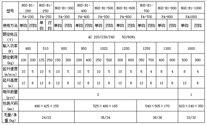 PA800微型電動葫蘆參數表: